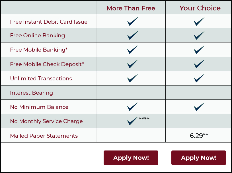 There are no monthly service fees with our More Than Free Checking account! With this account you also receive free services, unlimited transactions, and there’s no minimum balance requirement.