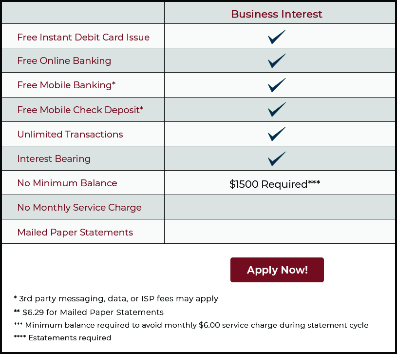 Our Business Interest Checking account is designed for businesses that maintain a higher balance to receive a tiered interest payout. Get more for your money! This account comes with competitive interest and free services.